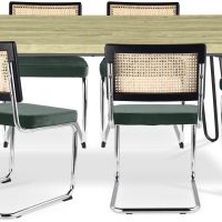 Este pack de mesa con patas hairpin y 6 sillas madera con asiento de terciopelo es perfecto para restaurantes, cafeterías y hoteles. La mesa de estilo industrial consta de patas de horquilla que le dan un toque moderno. Las 6 sillas de comedor tienen el respaldo en ratán natural con diseño de rejilla, lo que le da un estilo boho chic muy especial. El asiento de terciopelo es suave y cómodo, perfecto para disfrutar de una comida o una bebida en buena compañía.