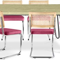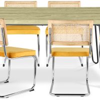 Este pack de mesa de madera con patas hairpin y 6 sillas madera y asiento de terciopelo es un producto de calidad premium, duradero y lujoso. Ideal para restaurantes, cafeterías y hoteles. La mesa de estilo industrial tiene un diseño único con patas de horquilla y las sillas tienen un respaldo en ratán en canage que le dará a tu espacio un toque de elegancia. Apuesta por este conjunto a un precio muy especial