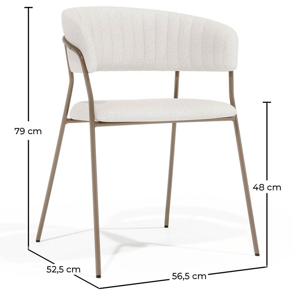 La silla de comedor tapizada en tela bouclé con una estructura de metal en color champagne es una pieza elegante y versátil que combina a la perfección estilo y comodidad. Su tapizado en tela bouclé le confiere una textura suave y acogedora, brindando una sensación de lujo y confort a quienes se sientan en ella. Esta tela también es duradera y resistente al desgaste, lo que la convierte en una opción ideal para espacios de alto tráfico como hoteles, restaurantes y también para el hogar. El metal utilizado en su estructura es resistente y robusto, garantizando una base sólida y estable para la silla. Además, el color champagne es elegante y versátil, lo que permite que se integre sin problemas en diferentes estilos de decoración.