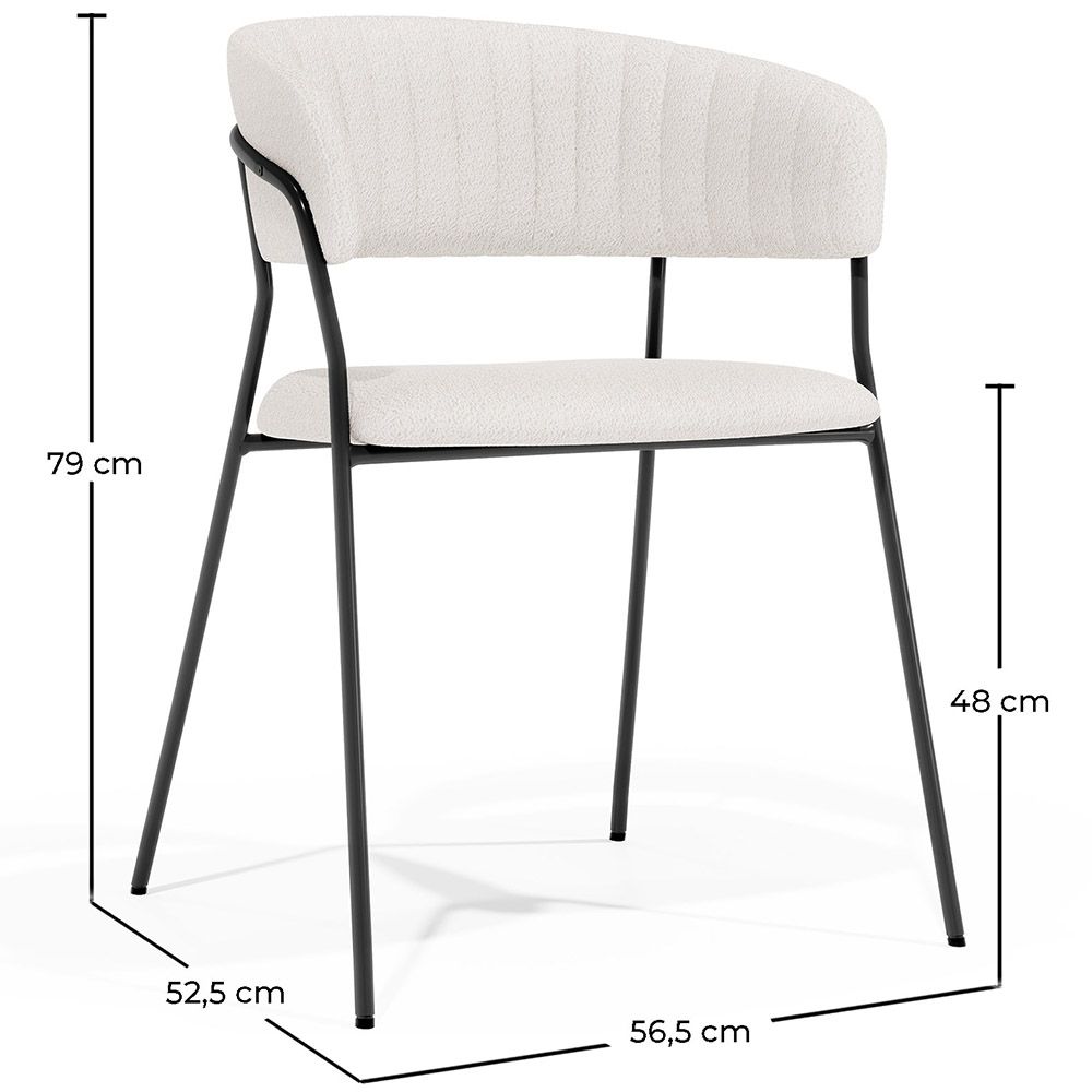 La silla de comedor tapizada en tela bouclé con una estructura de metal en color negro es una pieza elegante y versátil que combina a la perfección estilo y comodidad. Su tapizado en tela bouclé le confiere una textura suave y acogedora, brindando una sensación de lujo y confort a quienes se sientan en ella. Esta tela también es duradera y resistente al desgaste, lo que la convierte en una opción ideal para espacios de alto tráfico como hoteles, restaurantes y también para el hogar. El metal utilizado en su estructura es resistente y robusto, garantizando una base sólida y estable para la silla. Además, el color negro es elegante y versátil, lo que permite que se integre sin problemas en diferentes estilos de decoración.