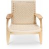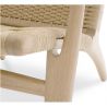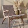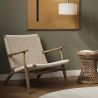 Esta silla es muy cómoda gracias a su suave asiento de fibra natural, sus patas y sus apoyabrazos, fabricados en madera de haya, son resistentes y sólidos.
